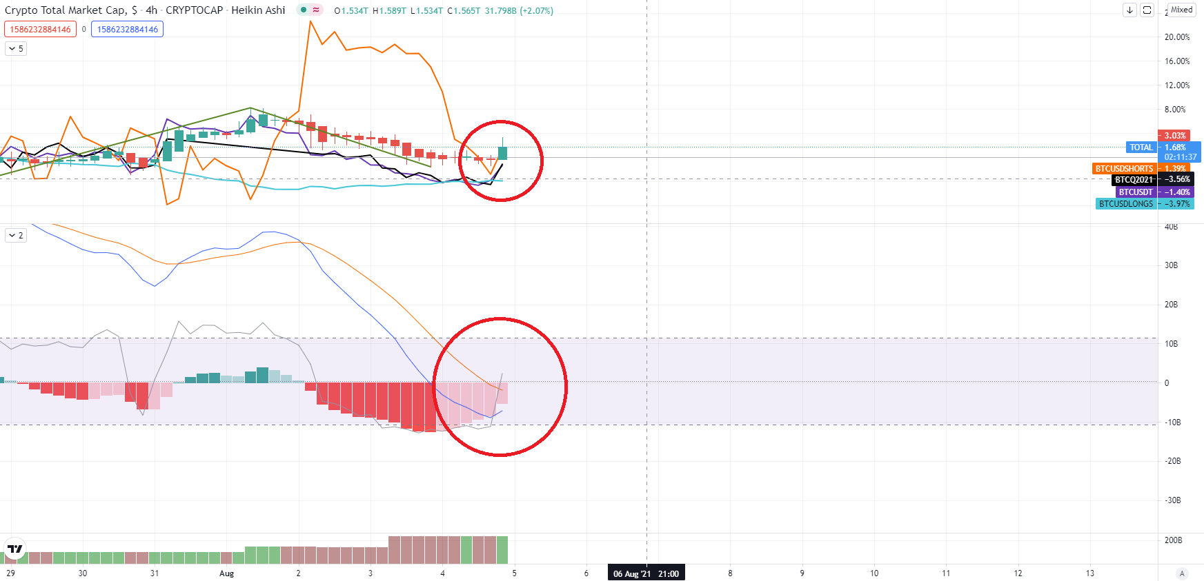 8월 4일 오후 1시 한국시간 기준 다행히 비트에 대한 매수세가 보다 나아져 강한 매수세 흐름이 보이기 시작했다.
