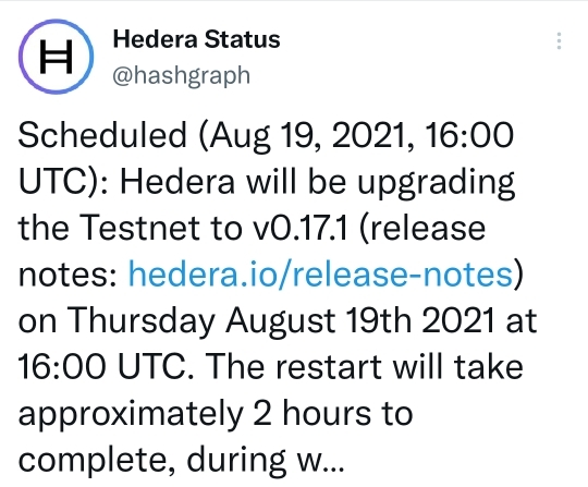 Hedera는 2021년 8월 19일 목요일 16:00 UTC에 Testnet을 v0.17.1(릴리스 노트: https://hedera.io/release-notes )로 업그레이드할 예정입니다.