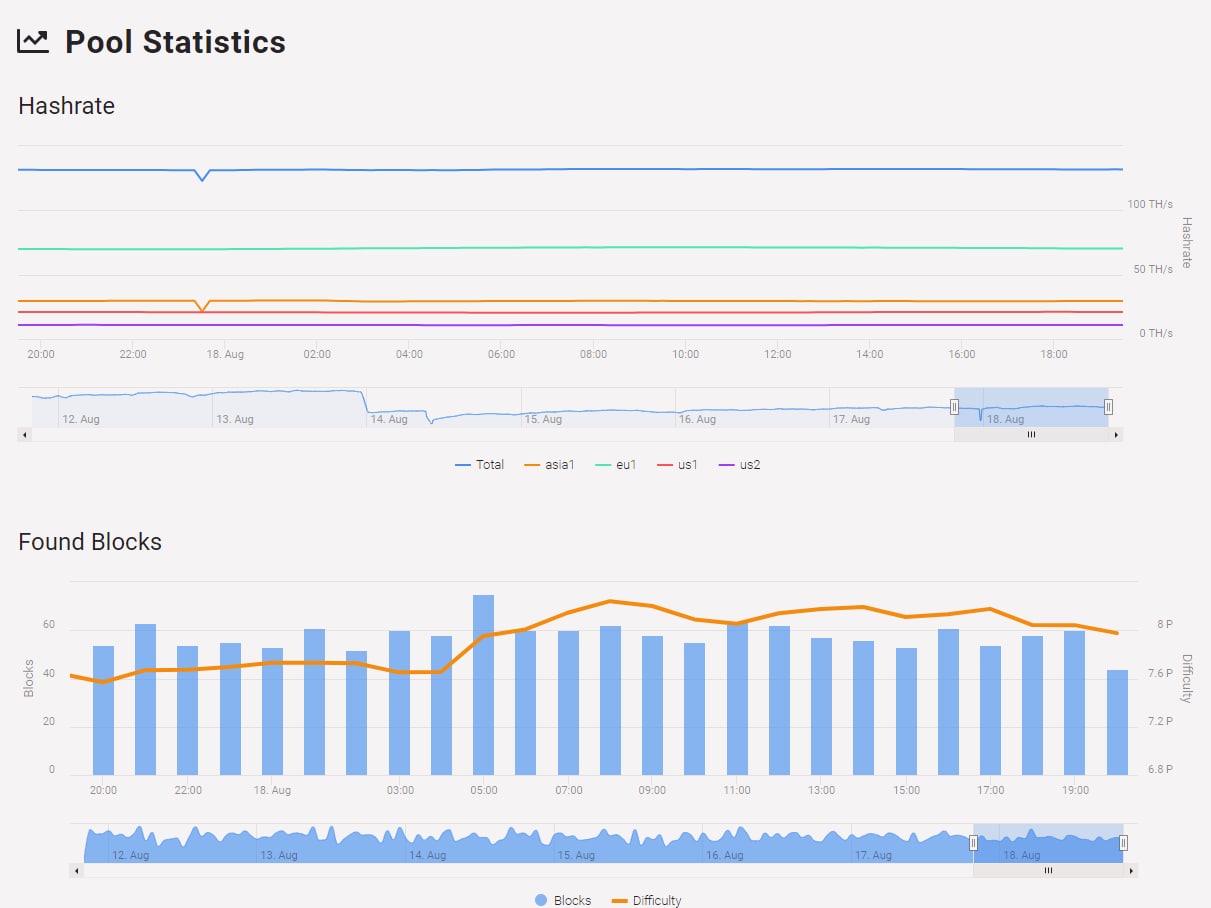 8월 18일, 이더 마인 공식 채널 통계에 따르면, 풀 가용능력 중 해시 레이트(채굴 속도)의 데이터가 매우 평온하게 채굴되는 모습을 갖추고 있습니다. 3일 전보다도 더 안정성 있게 채굴하고 있고, 채굴 경쟁도 심화가 있는 편인지라 이더 마인도 파인드 블록수는 조금 줄어든 편이네요.