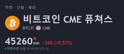 금일 현재 중반부를 달리고 있는 비트코인 시카고 장 금액은 45260$입니다. 현물 장보다 50$ 수준인 45303$(코인베이스 기준) 차이가 있습니다.