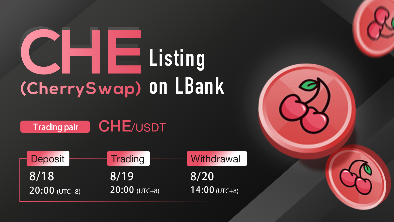 CHE(CherrySwap) 는 2021년 8월 19일(UTC+8) 20:00 LBank에 상장되며, 자세한 내용은 다음과 같습니다.