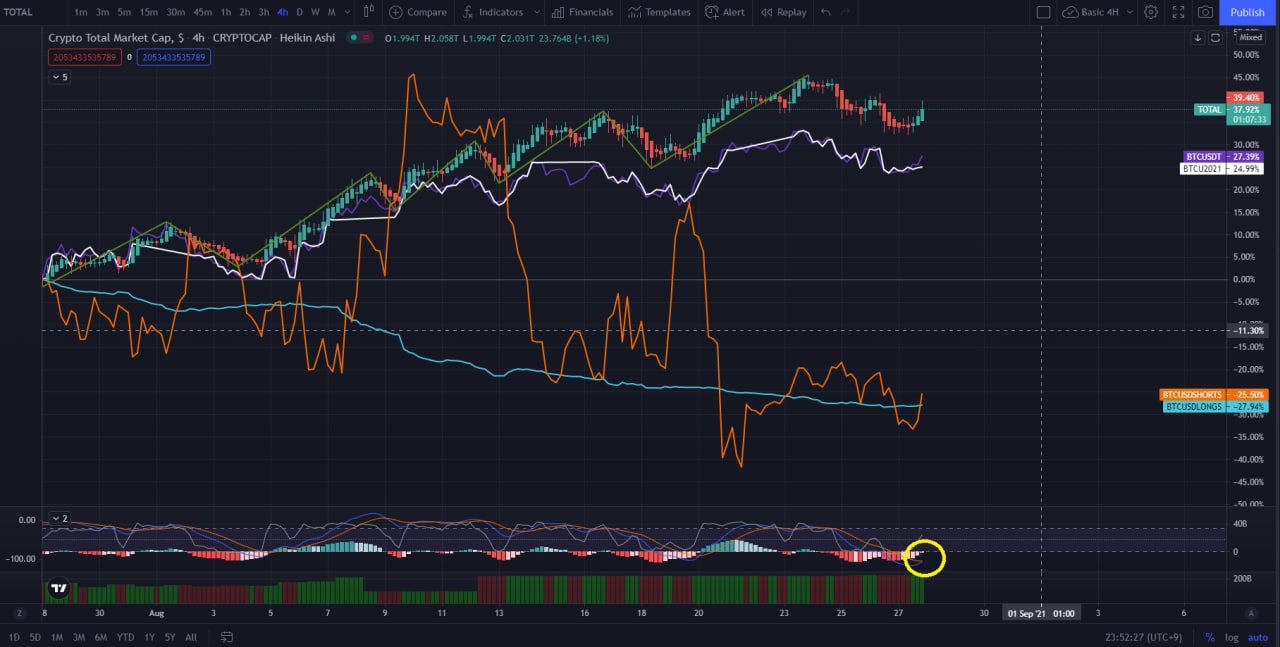 롱 미체결이 감소추세와 둔화된 상태에서 반등이 보이는 편입니다. 가격이 급격하게 조정이 왔고 반등이 있었습니다. 하지만 급 숏 미체결 비율이 상승하는 탓에 매우 격하게 올라줬던 상방봉이 크게 조정 받았습니다.