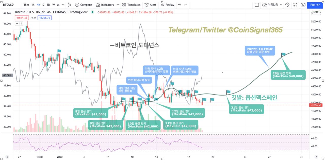 📌개인적으로 지난 1월 8일부터 데리빗 옵션만기의 ‘맥스페인(MaxPain)가격*’에 따른 비트코인 가격 예측 흐름도를 작도해왔음(변동된 맥스페인가격이 있어서 최근 업데이트 했음)